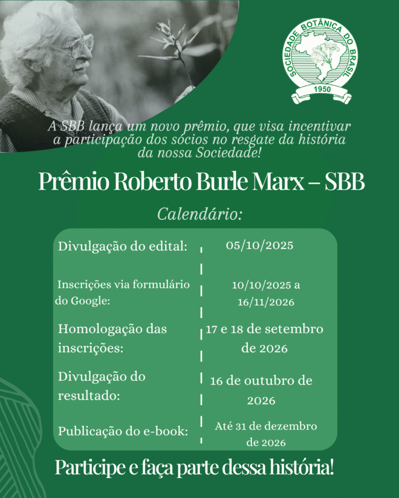 A Sociedade Botânica do Brasil (SBB) tem o prazer de anunciar o lançamento do Prêmio Roberto Burle Marx (PRBM), criado com o objetivo de dar continuidade ao resgate e preservação das informações sobre os setores da SBB, desde sua criação.